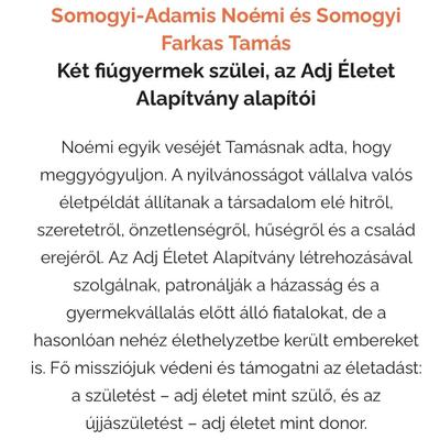 Noémi egyik veséjét Tamásnak adta, hogy meggyógyuljon. A nyilvánosságot vállalva valós életpéldát állítanak a társadalom elé hitről, szeretetről, önzetlenségről, hűségről és a család erejéről. Az Adj Életet Alapítvány létrehozásával szolgálnak, patronálják a házasság és a gyermekvállalás előtt álló fiatalokat, de a hasonlóan nehéz élethelyzetbe került embereket is. Fő missziójuk védeni és támogatni az életadást: a születést – adj életet mint szülő, és az újjászületést – adj életet mint donor.